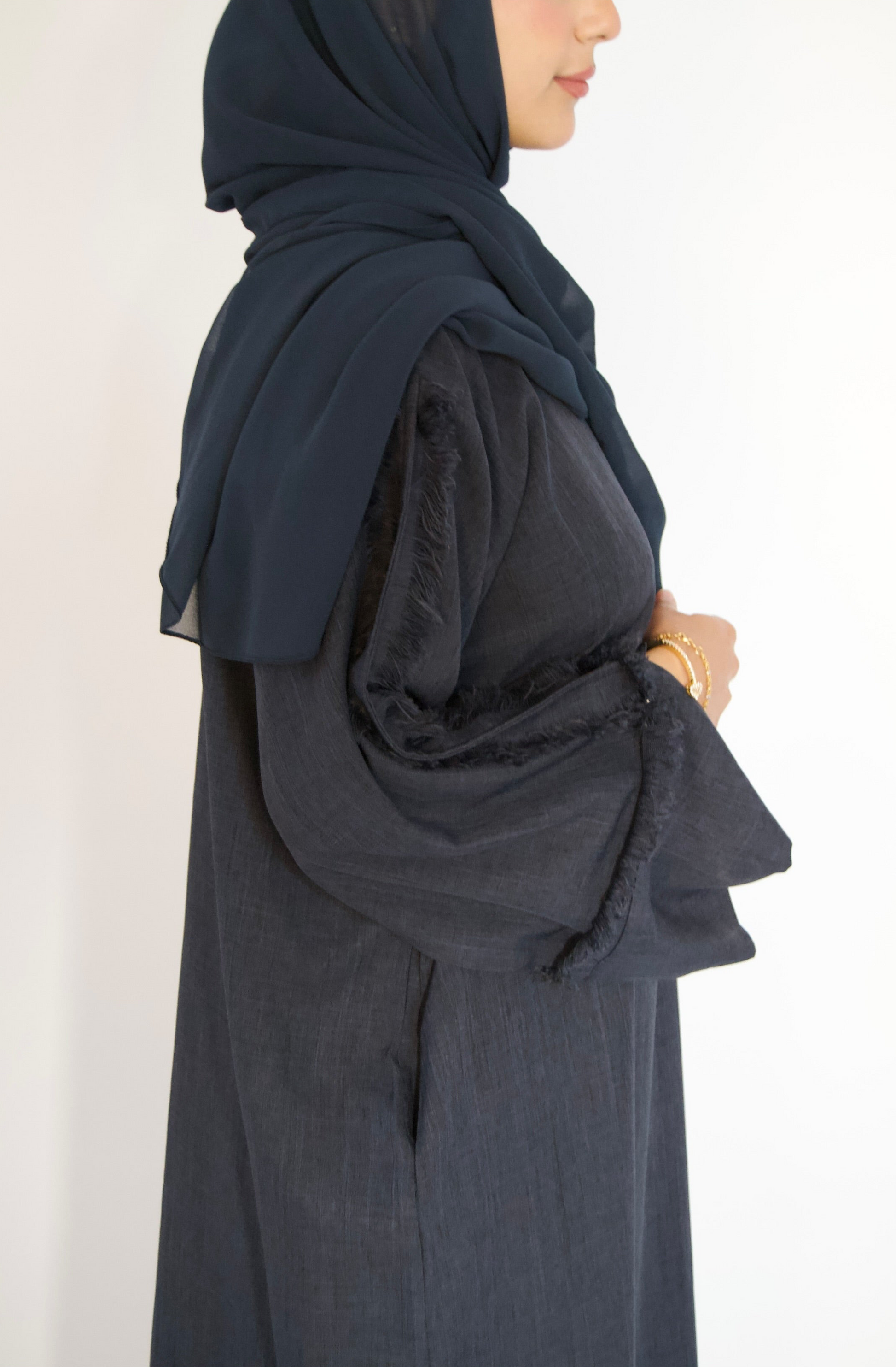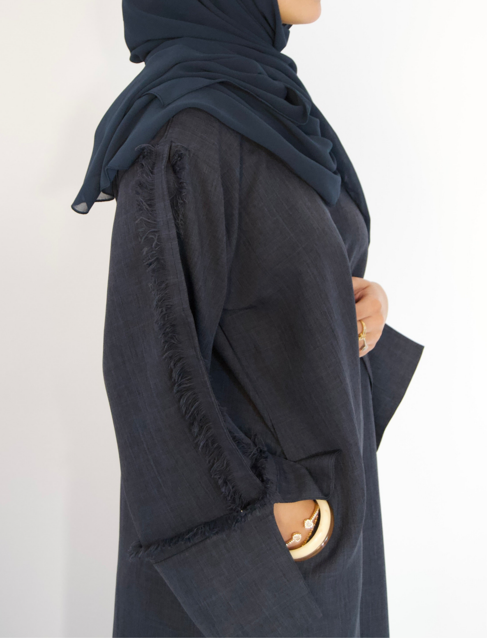 The Abāyah is elevated with a tasteful slit cut on the sleeves, adding a subtle yet chic detail, while the arms are adorned with a refined design that brings out its sophistication. A timeless piece that balances comfort, elegance, and functionality—ideal for everyday wear or special occasions during the cooler season.